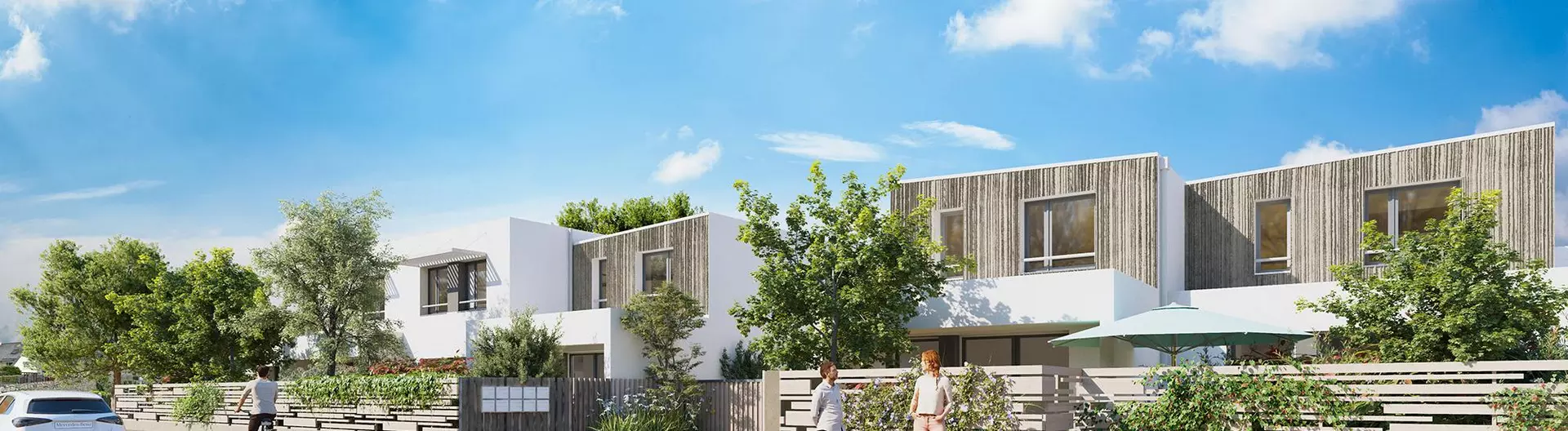 Chaque logement de type T4 et T5 de généreux et confortables volumes. Les façades blanches s’habillent à certains endroits d’un enduit matricé, touche d’une décoration de charme, réhaussé par des notes de gris anthracite. Les toitures, à la fois en monopente douce aux tons gris clair et relevées d’acrotères gris ardoisés, offrent d’esthétiques variations qui confèrent modernité et dynamisme à un ensemble par ailleurs très homogène.